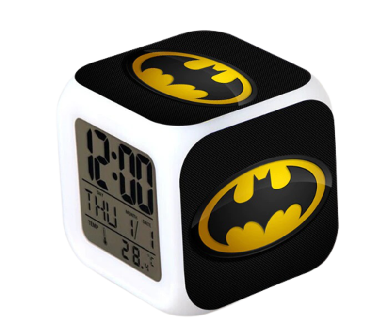 Este despertador es el favorito de los fans de Batman. Posee luz y pantalla digital que muestra fecha y temperatura. Está disponible en varios diseños.