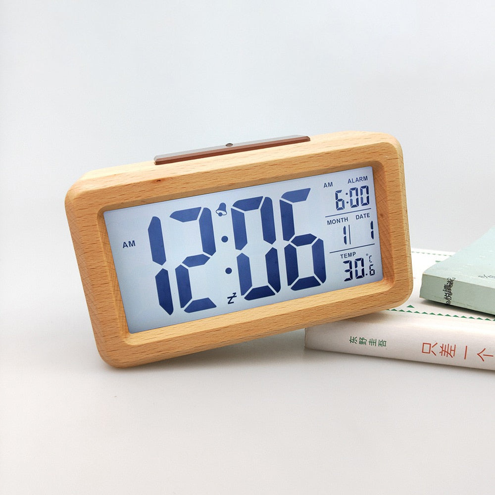 Conserva el estilo fresco y natural de tu hogar con este reloj despertador de diseño símil madera. En su pantalla digital muestra fecha y temperatura.